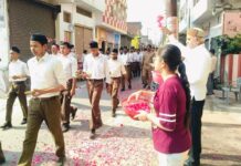 वाद्य यंत्रों की ध्वनि के साथ कदम से कदम मिलाकर साथ चले सैकड़ों स्वयंसेवक