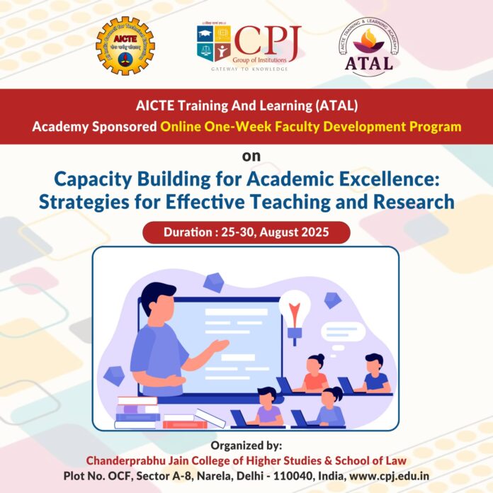 चंद्रप्रभु जैन उच्च अध्ययन महाविद्यालय एवं विधि विद्यालय, नरेला, दिल्ली ने 25-30 अगस्त, 2025 तक “शैक्षणिक उत्कृष्टता हेतु क्षमता निर्माण: प्रभावी शिक्षण एवं अनुसंधान हेतु रणनीतियाँ” विषय पर एआईसीटीई प्रशिक्षण एवं शिक्षण (एटीएएल) अकादमी द्वारा प्रायोजित एक सप्ताह का ऑनलाइन संकाय विकास कार्यक्रम (एफडीपी) सफलतापूर्वक आयोजित किया।