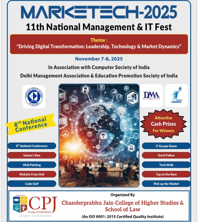 जीजीएसआईपी विश्वविद्यालय से संबद्ध सीपीजे कॉलेज नरेला, 7 और 8 नवंबर, 2025 को सीपीजे कॉलेज परिसर में “डिजिटल परिवर्तन को गति देना: नेतृत्व, प्रौद्योगिकी और बाजार की गतिशीलता” विषय पर “मार्केटेक-2025: 11वां राष्ट्रीय प्रबंधन एवं आईटी उत्सव” का आयोजन करेगा। महासचिव डॉ. अभिषेक जैन और महानिदेशक डॉ. युगांक चतुर्वेदी ने एक संयुक्त वक्तव्य में बताया कि भारत भर के विश्वविद्यालयों/संस्थानों के 200 से अधिक छात्र विभिन्न प्रतियोगिताओं में भाग लेंगे। यह एक शिक्षाप्रद, मनोरंजक और यादगार कार्यक्रम होगा। उत्सव की थीम से संबंधित, इस प्रबंधन एवं तकनीकी उत्सव के दौरान छात्रों के लिए विभिन्न प्रतियोगिताओं की योजना बनाई गई है।