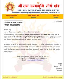 महामहिम राष्ट्रपति श्रीमती द्रौपदी मुर्मू जी का आगमन प्रस्तावित है, जिसमें पूज्य महंत नृत्यगोपाल दास जी (अध्यक्ष), स्वामी गोविंददेव गिरी जी (कोषाध्यक्ष) एवं श्री चंपत राय जी (महासचिव) के सान्निध्य में कार्यक्रम संपन्न होगा।