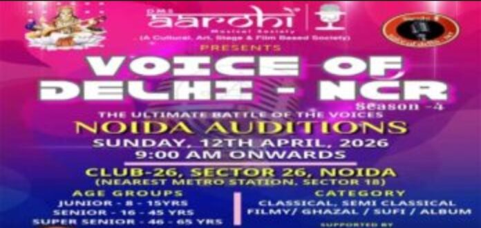 डीएमएस आरोही म्यूजिकल सोसाइटी (रजि.) नईदिल्ली द्वारा आयोजित वॉइस ऑफ दिल्ली-एनसीआर सीजन-4 की तैयारियां जोर-शोर से चल रही हैं। इसी क्रम में प्रतिभागियों के चयन के लिए 12 अप्रैल 2026 को नोएडा में ऑडिशन आयोजित किए गए। इस प्रतिभा खोज कार्यक्रम में दिल्ली-एनसीआर क्षेत्र के गायकों ने अपनी गायन प्रतिभा का प्रदर्शन किया।