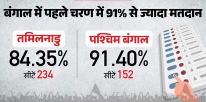 आजादी के बाद से पश्चिम बंगाल और तमिलनाडु में अब तक का सबसे अधिक मतदान प्रतिशत दर्ज किया गया। पश्चिम बंगाल में पहले चरण में 91.40 प्रतिशत मतदान दर्ज किया गया है। जबकि तमिलनाडु में 84.35 प्रतिशत मतदान दर्ज किया गया।